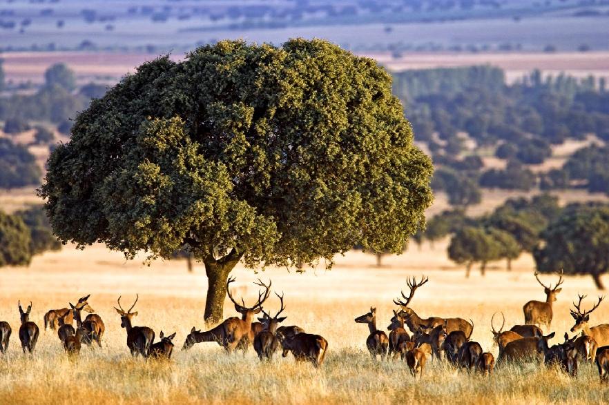 Como paisaje forestal único, asistiremos también al de las dehesas ibéricas atravesadas por la ruta de la trashumancia; con los bosques esclerófilos, las matas de encinas y los alcornoques.