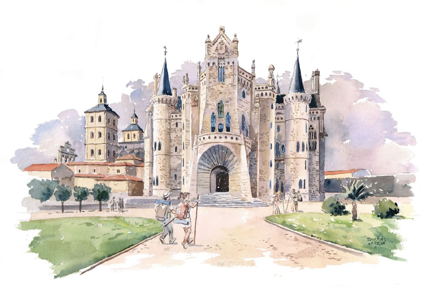 En nuestra Acuarela de viaje dedicada al Camino de Santiago, Zacarías Cerezo ha logrado trasladar, desde la rauda composición que permite esta, para mí, tan difícil técnica de la acuarela, el alma imperecedera de la ruta. Lo ha conseguido tanto a través de la estática de sus monumentos, en la solidez del gran edificio y la humildad de la arquitectura popular, como en la dinámica de los paisajes con figurantes del presente, unos protagonistas que somos, ni más ni menos, que nosotros mismos, los peregrinos.
